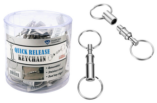Stainless steel, 3" L Overall, 1.5" L center piece, Press the narrow end to quick release the keychain into 2 parts